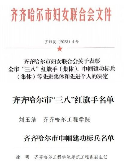 3月22日,齐齐哈尔市妇女联合会发布了“齐齐哈尔市妇女联合会关于表彰全市“三八”红旗手(集体)·巾帼建功标兵(集体)等先进集体和先进个人的决定”,我校刘玉洁老师获“市三八红旗手”、徐明老师获“市巾帼建功标兵”荣誉称号。